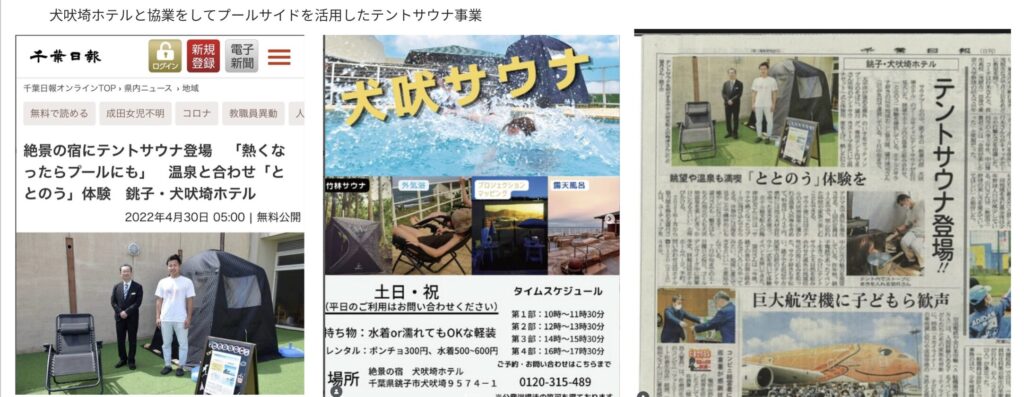 犬吠埼ホテルさんと協業して、プールサイドを活用したテントサウナ事業を展開しました。銚子の観光資源を活かした新しい観光コンテンツとして、健康促進と地域観光の両立を目指したプロジェクトです。